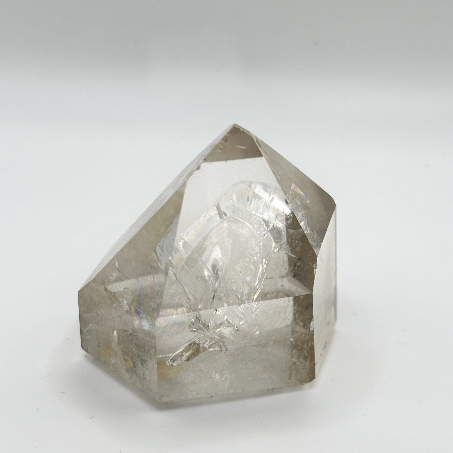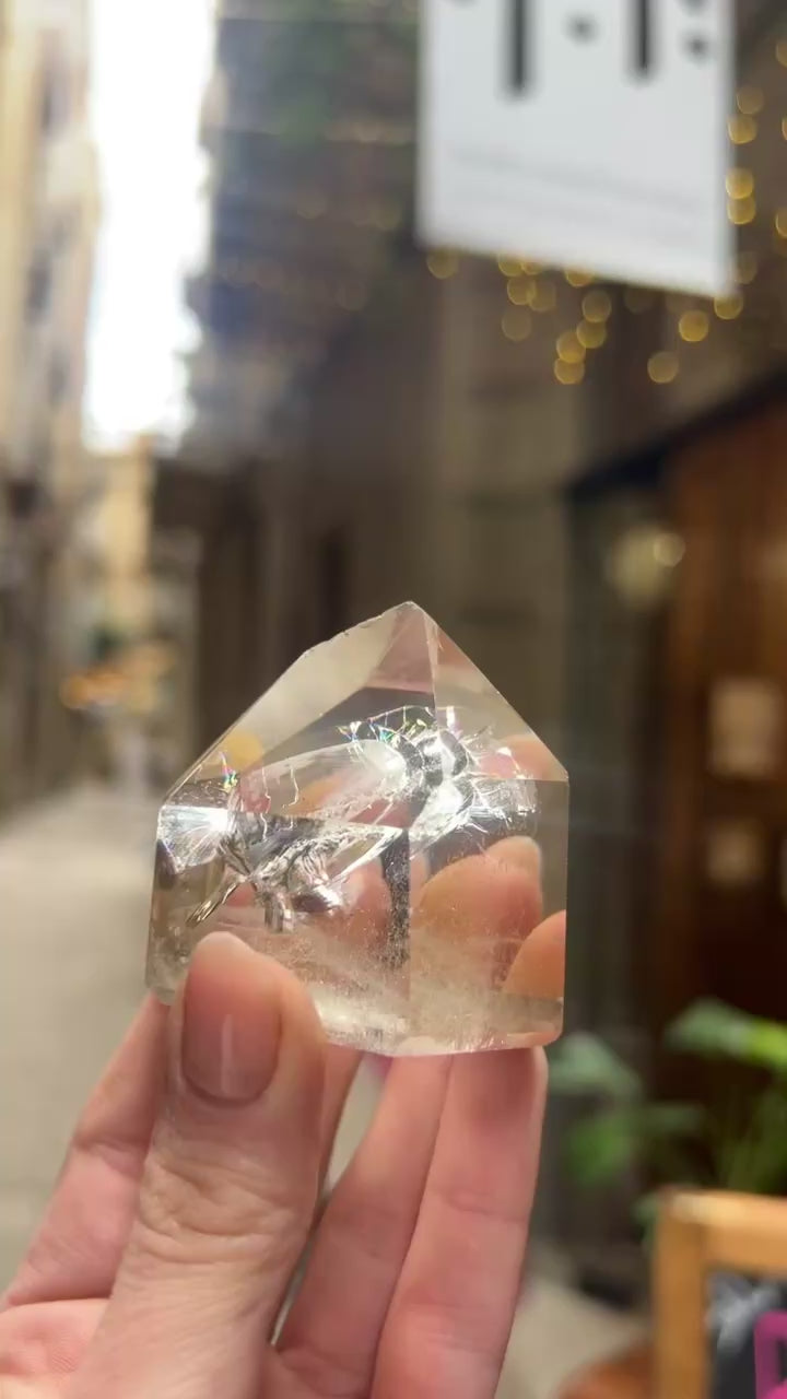 Esta pieza única de Cuarzo arcoíris revela en su interior un espectro de luz que se manifiesta cuando el sol la atraviesa, como si guardara un universo secreto.