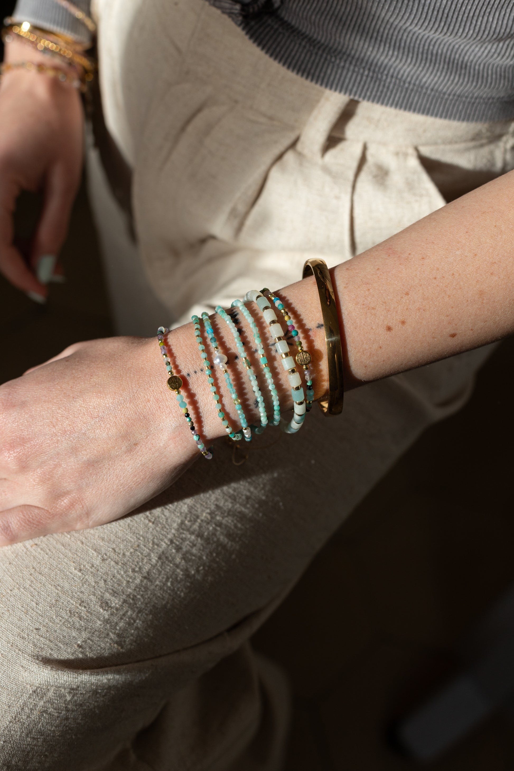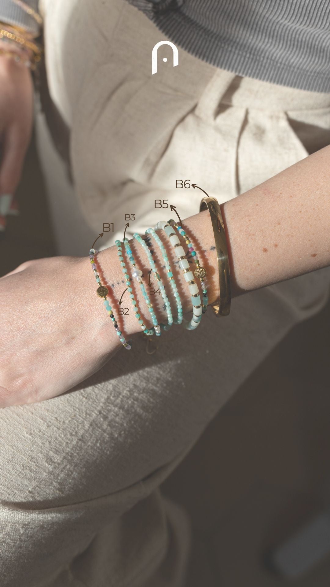 Inspirados en la suavidad del mar, estos brazaletes están elaborados con aguamarina natural, una piedra que transmite serenidad, confianza y claridad emocional. Su delicado tono azul verdoso aporta una energía refrescante y armónica, ideal para quienes buscan equilibrio y conexión interior.