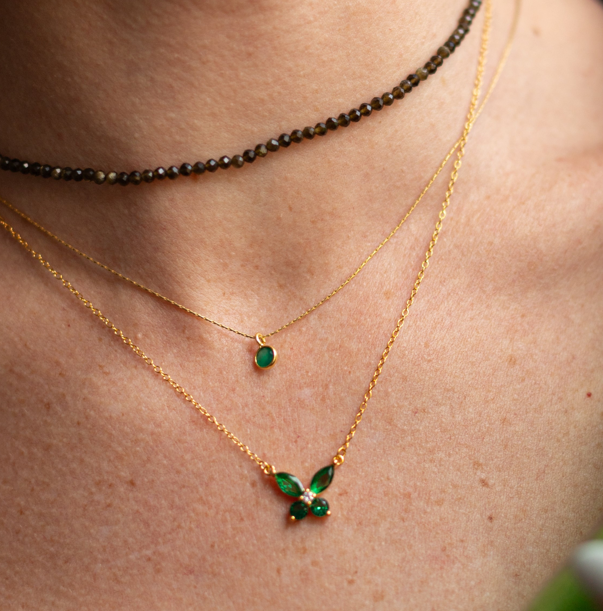 Este collar en forma de mariposa con esmeraldas y baño de oro es una joya que simboliza la transformación y el renacer. La mariposa, un símbolo de libertad y cambio, se adorna con esmeraldas que aportan paz, renovación y equilibrio. Su baño de oro le da un toque de lujo y sofisticación, convirtiéndolo en una pieza única para destacar en cualquier ocasión.